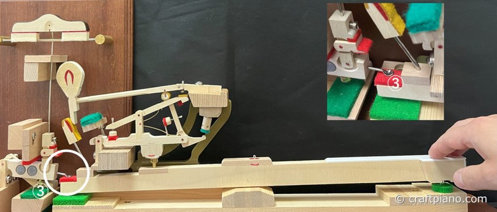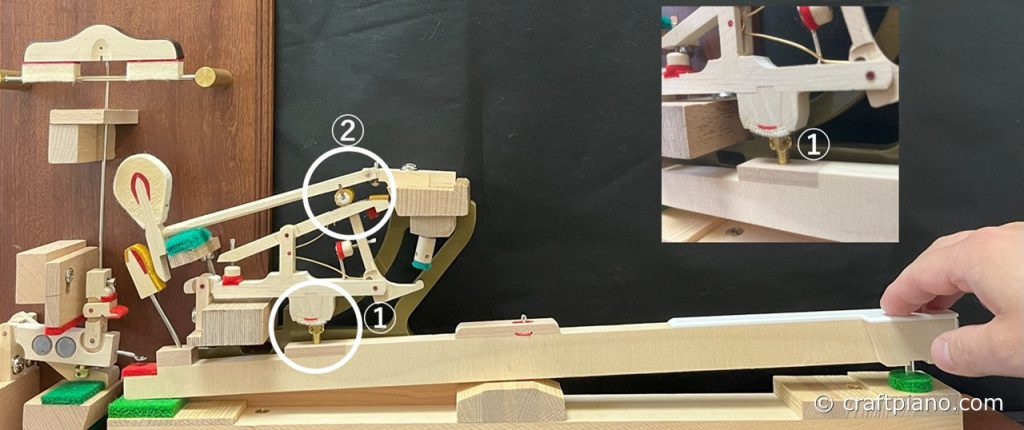 ②レペティションレバーがハンマーローラーを押し上げ、ハンマーが上昇します。