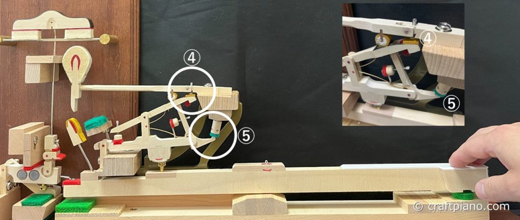 ⑤ジャックがレギュレティングスクリューに当たって運動の方向が上昇から右方向への回転に変わります。ジャックがローラーから抜ける摩擦のためタッチがさらに重くなります。