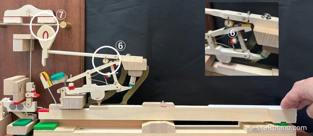 ⑥ジャックの先端はハンマーローラーの下から外れます。これ以降をアフタータッチと言います。