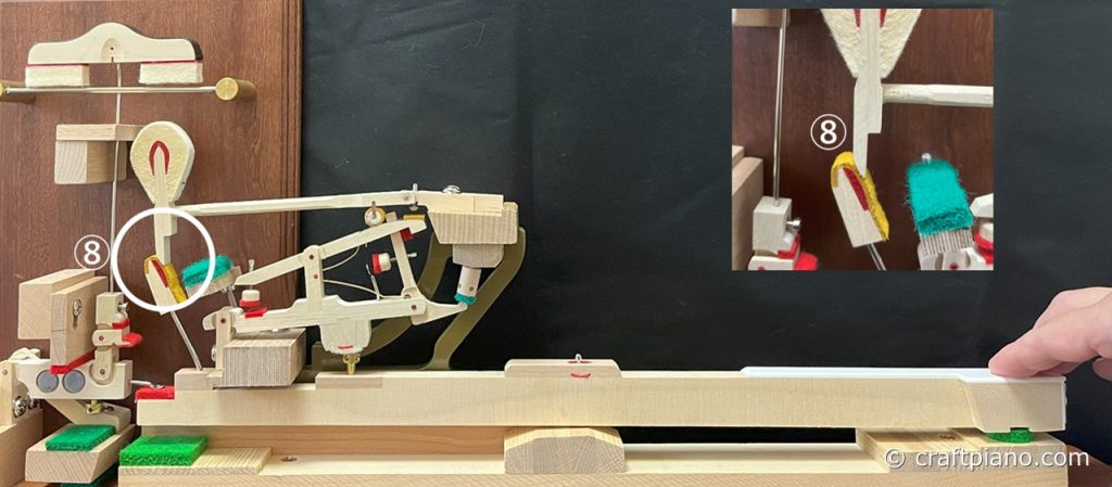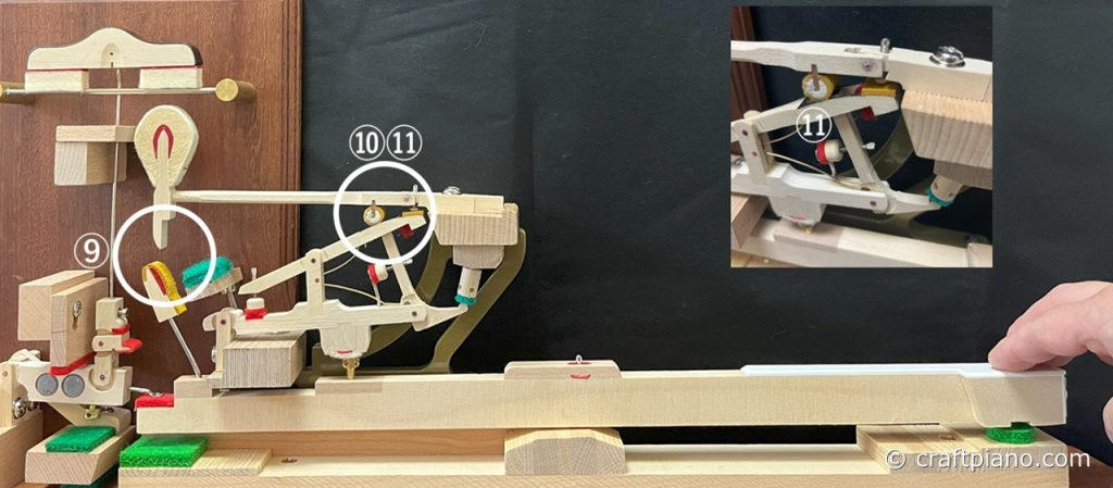 ⑨鍵盤をわずかに戻すと、ハンマーはバックチェックから解放されます。
