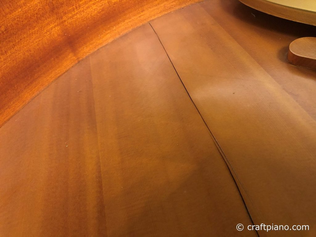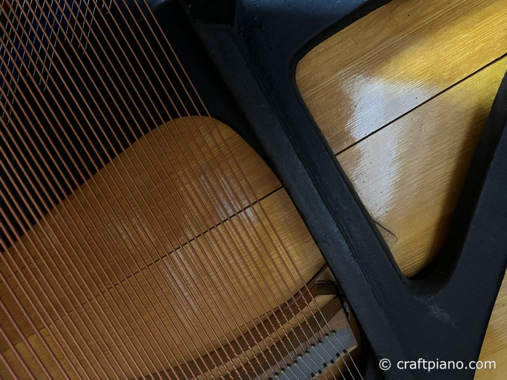 過乾燥の環境、特に床暖房のお部屋に置かれたピアノや、古いピアノは経年変化で変形して響鳴板が割れてしまうことがあります。本格的に直すためにはオーバーホールしなければなりませんが応急処置できる場合もあります。